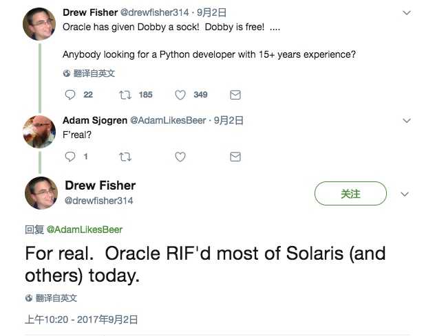 来自前 Sun 社区的消息表明,一月份的传闻(Oracle 裁员 450 人)成为了现实,上周五,Oracle 裁掉了 Solaris 和 SPARC 团队的核心员工,选择这个时候( 美国劳动节 ( Labor Day ) 前的周末)或许是希望这个消息被大众所忽略。