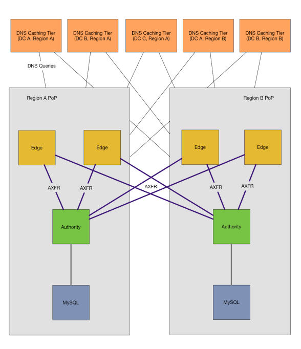 无论地域或位置如何,边缘主机使用权威层进行区域传输。我们的 区域 zone 并没有大到在每个 地域 region 保留所有 区域 zone 的副本成为问题。(LCTT 译注:此处原文“Our zones are not large enough that keeping a copy of all of them in every region is a problem.”,根据上下文理解而翻译。)这意味着对于每个区域,即使某个地域处于脱机状态,或者上游服务提供商存在连接问题,所有缓存服务器都可以访问具备所有区域的本地副本的本地边缘服务器。这种变化在面对连接问题方面已被证明是相当有弹性的,并且在不久前本来会导致客户面临停止服务的故障期间帮助保持 GitHub 可用。