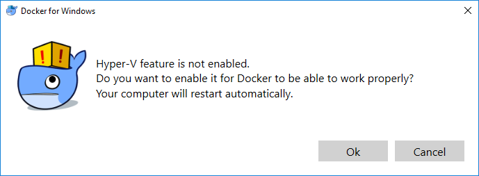 重启后,Docker 就已经启动了。Docker 要求启用 Hyper-V 功能,因此它会提示你启用并重启。点击“OK”来为 Docker 启用它并重启系统。