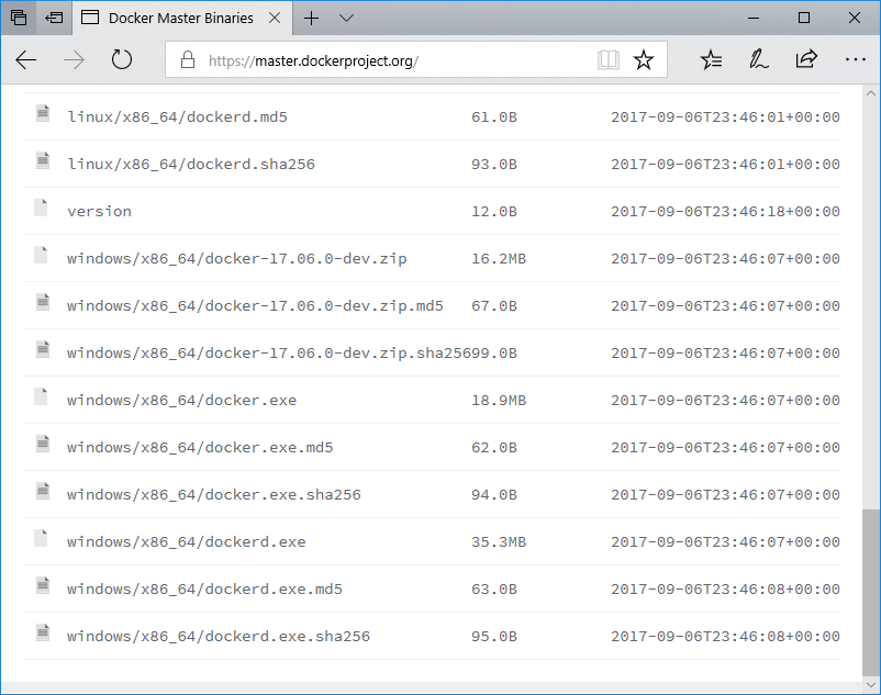 从 master.dockerproject.org 下载 dockerd.exe 和 docker.exe,并将其放到安全的地方,比如你自己的文件夹中。它们用于在下一步中启动 Ubuntu 容器。