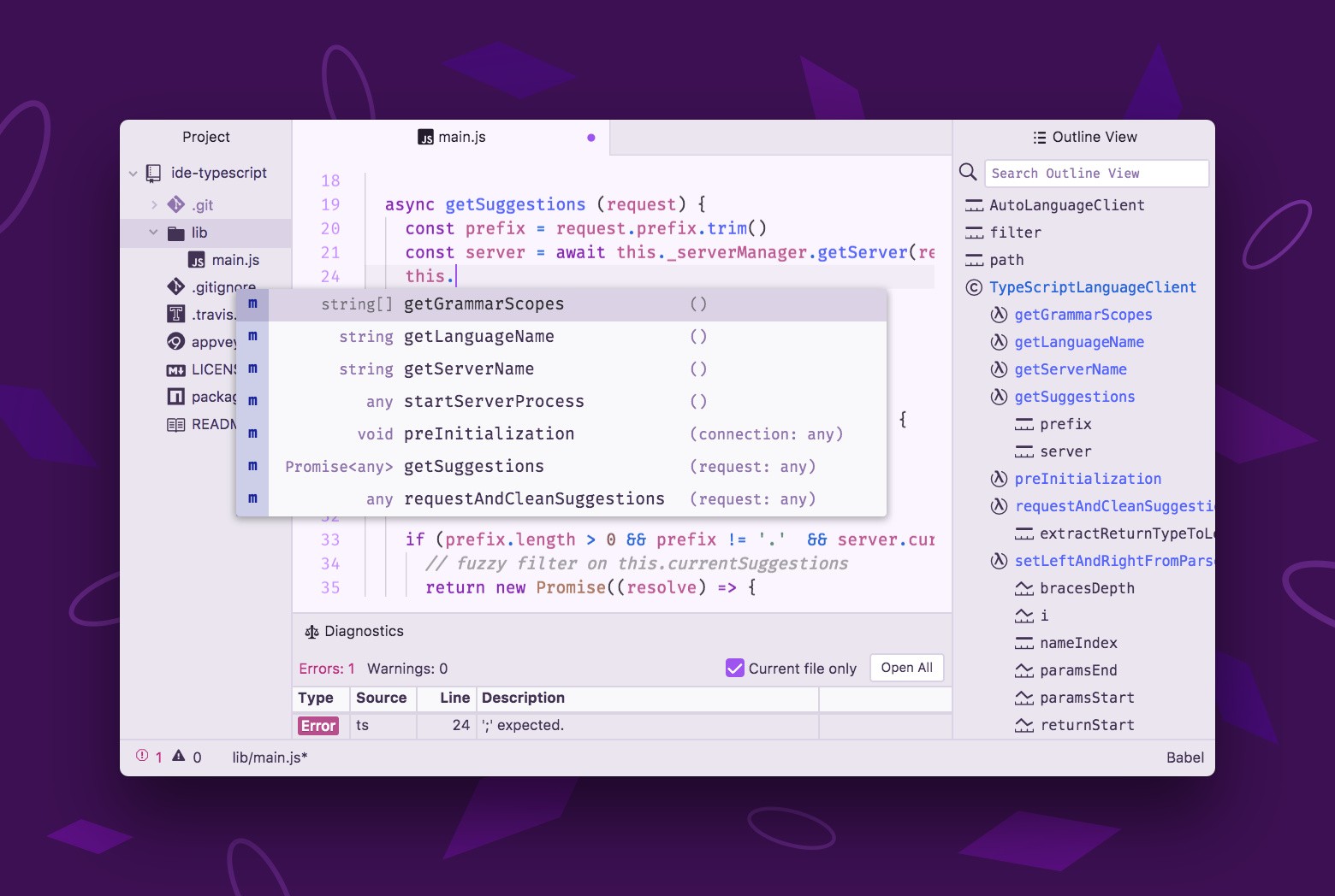 这将在你的 Atom 中呈现 IDE 界面,但是要成为一个完全可工作的 IDE ,你还需要安装你的语言服务器支持。目前,你可以从以下五种语言中选择:ide-typescript (TypeScript & JavaScript)、 ide-php (PHP)、 ide-java (Java)、 ide-csharp (C#)以及 ide-flowtype (Flow)。