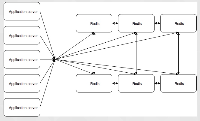 将会有大量的应用服务器与 twemproxy 进行通信,这会将它们的调用路由到合适的 Redis 主节点,twemproxy 将从 sentinal 集群获取主节点的信息,它将控制哪台 Redis 实例是主,哪台是从。这个设置是复杂的,而且仍有单点故障,它依赖于 twemproxy 来处理分片,来连接到正确的 Redis 实例。它具有对应用程序透明的优点,所以我们可以在理论上做到将现有的应用程序转移到这个 Redis 配置,而不用改变应用程序。但是我们要从头开始构建一个应用程序,所以迁移应用程序不是一个必需条件。