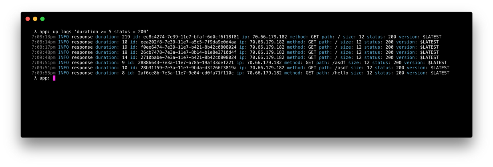 对于 $0.5/GB 的低价格,你可以使用 CloudWatch 日志进行结构化日志查询和跟踪。Up 实现了一种用于改进 CloudWatch 提供的自定义查询语言,专门用于查询结构化 JSON 日志。