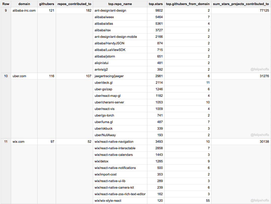 - 不是每个用户都在 GitHub 上使用其组织的邮件。有许多人使用 gmail.com、users.noreply.github.com 和其它邮件托管商的邮件地址。有时候这是为了保持匿名和保护其公司邮箱,但是如果我不能定位其公司域名,这些用户我就不会统计。抱歉。