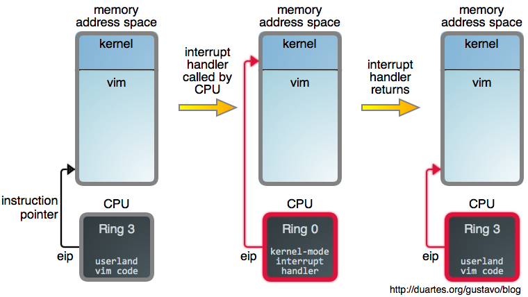 此处请留意,中断的到来是如何触发 CPU 到 Ring 0 内核模式的切换而未有改变当前活跃的任务。这看上去就像,Vim 编辑器直接面向操作系统内核产生了一次神奇的函数调用,但 Vim 还在那里,它的地址空间原封未动,等待着执行流返回。