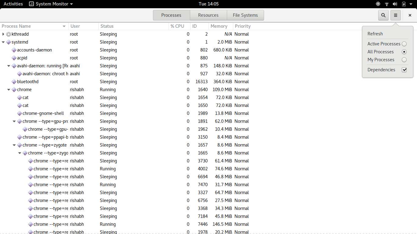 你可以通过 System-Monitor 查看当前进程。