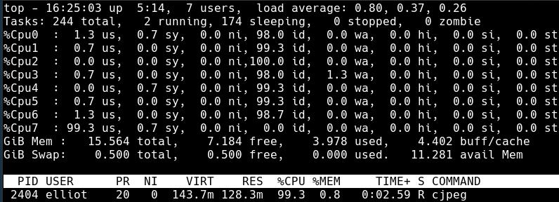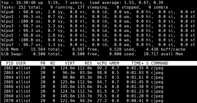 这次压缩所有图像的时间缩减到了 0m10.814s。从 top 显示中可以很清楚地看出不同: