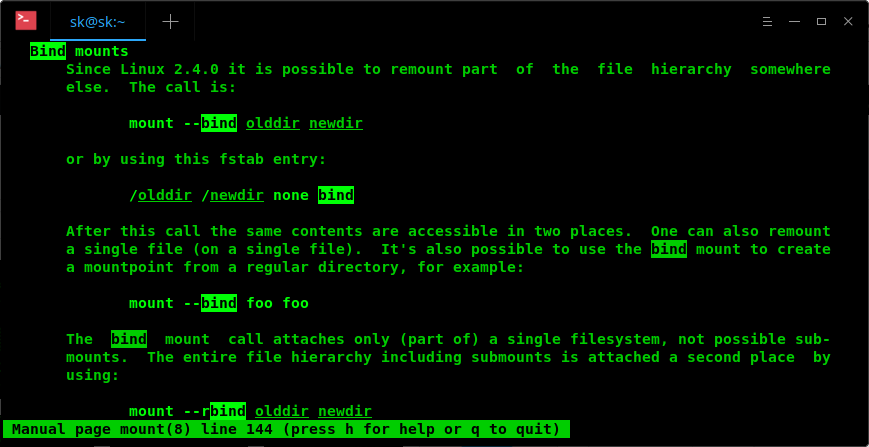 假设你正在查看 mount 命令的 man 页,想要寻找关于 -bind 选项的相关信息。可以输入: