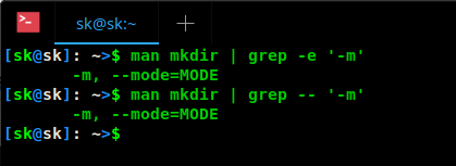 man mkdir | less +/-m