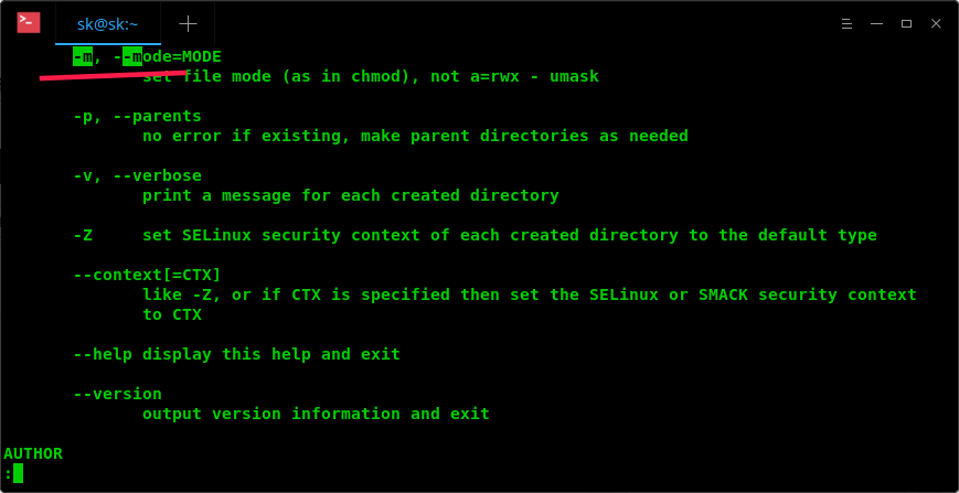 这个命令会显示出 mkdir 命令 man 页中第一次出现 -m 时的内容。从上面命令中我们可以看到 -m 表示的是 “MODE”(chmod)。