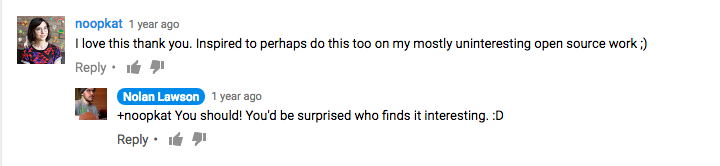 我的朋友 Nolan Lawson 让我 真正开始做 这件事,而不只是单纯地 想要做 。我看了他 在周末直播开源工作 ,做得棒极了。他解释了他当时做的每一件事。是的,每一件事,包括回复 GitHub 上的 问题 issues ,鉴别 bug ,在 分支 branches 中调试程序,你知道的。这令我着迷,因为 Nolan 使他的开源库得到了广泛的使用。他的开源生活和我的完全不一样。