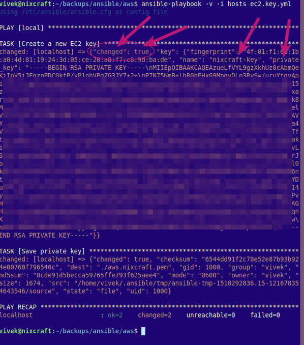 你一定在想我是如何使用变量名的,比如 ec2_key_result.changed 和 ec2_key_result.key.private_key。它们在哪里定义过吗?变量的值是通过 API 调用返回的。简单地使用 -v 选项运行 ansible-playbook 命令来查看这样的信息: