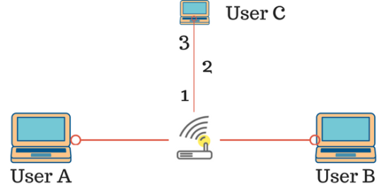 从下图中可以看到 3 台电脑分别对应的 A、B、C 三个用户。A 和 B 本地相连,而 C 的位置则比较远,它与本地之间有 1、2、3 三个连接点。
