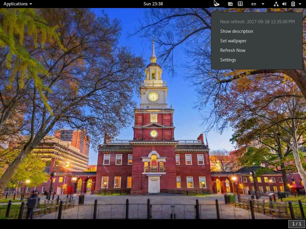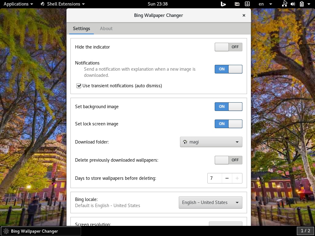 必应桌面墙纸更换器会自动下载并将桌面壁纸更改为当天的必应照片。所有的壁纸都储存在 /home/[user]/Pictures/BingWallpapers/。