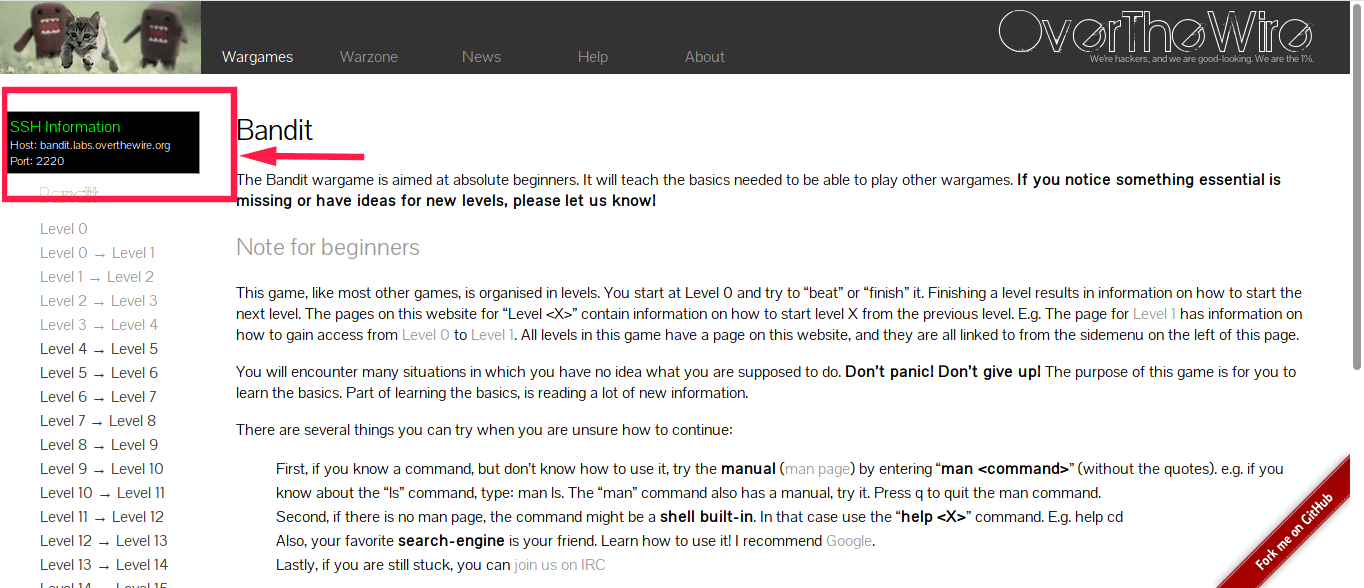 例如,让我们来玩 Bandit 游戏吧。为此,单击 Wargames 主页上的 Bandit 链接。在左上角,你会看到 Bandit 游戏的 SSH 信息。