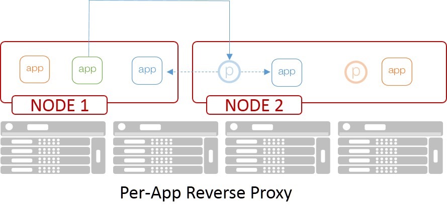 每个“应用程序”有一个代理。任何想要连接到应用程序的客户端都连接到代理,代理然后选择并转发请求到适当的实例。如果绿色应用想要与蓝色应用通信,它会向蓝色代理发送请求,蓝色代理会确定蓝色应用的两个实例中的哪一个应该响应该请求。