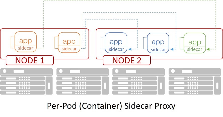 这种模型也被称为服务网格路由。在这个模型中,每个容器都有自己的代理。