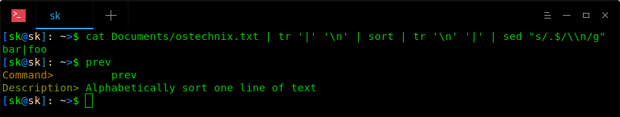 $ cat Documents/ostechnix.txt | tr '|' '\n' | sort | tr '\n' '|' | sed "s/.$/\\n/g"