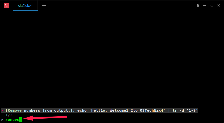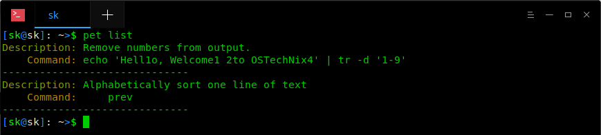 这是一个简单的命令,用于从 echo 命令输出中删除所有数字。你可以很轻松地记住它。但是,如果你很少使用它,几天后你可能会完全忘记它。当然,我们可以使用 CTRL+R 搜索历史记录,但 Pet 会更容易。另外,Pet 可以帮助你添加任意数量的条目。