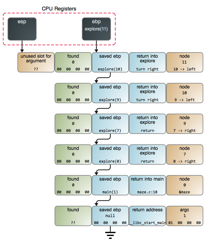 当我们在 maze.c:13 中找到奶酪时,栈的情况如下图所示。你也可以在 GDB 输出 中看到更详细的数据,它是使用 命令 采集的数据。