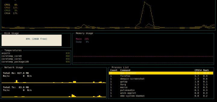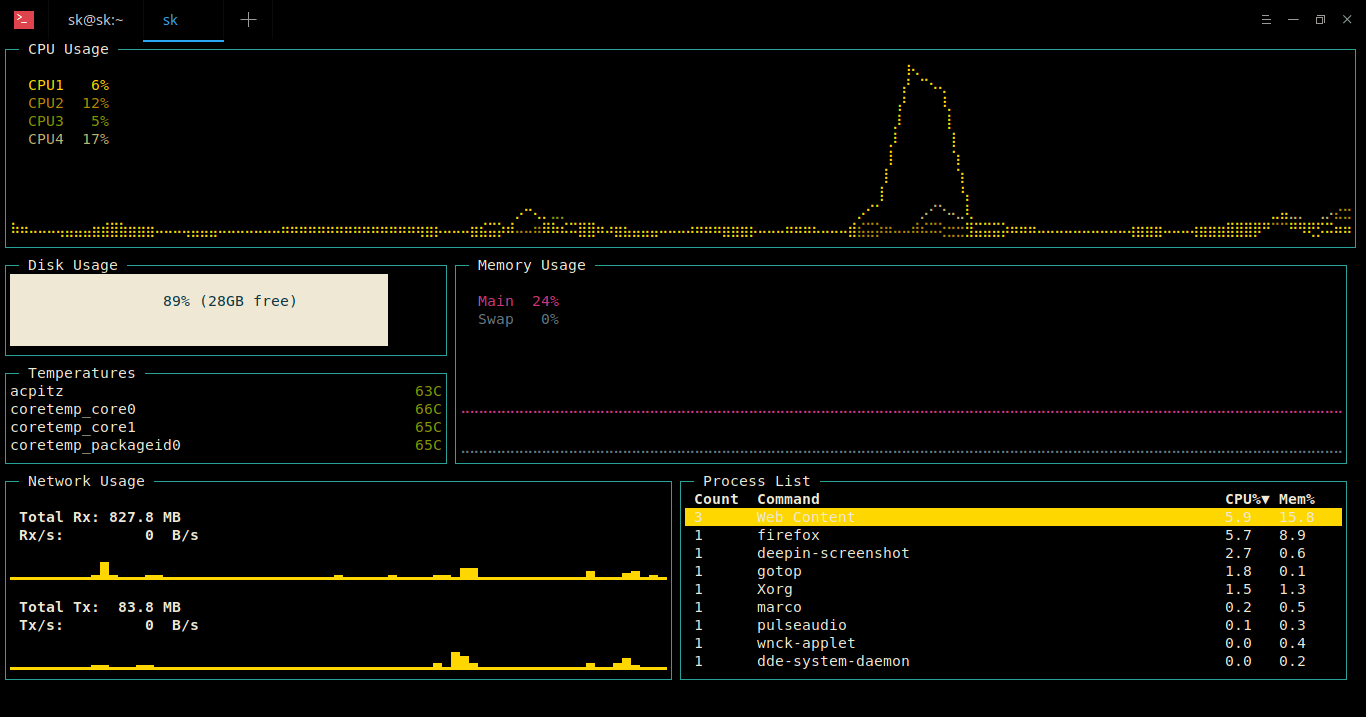 这样就行了!你将在简单的 TUI 窗口中看到系统 CPU、磁盘、内存、网络、CPU温度和进程列表的使用情况。