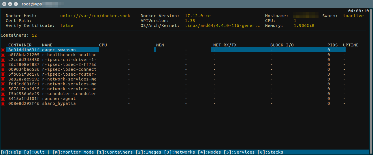 该操作需要在容器管理界面完成(在上一步的基础上,点击 Stats+Top 选项)。另外,也可以按下 s 打开容器资源利用率界面。