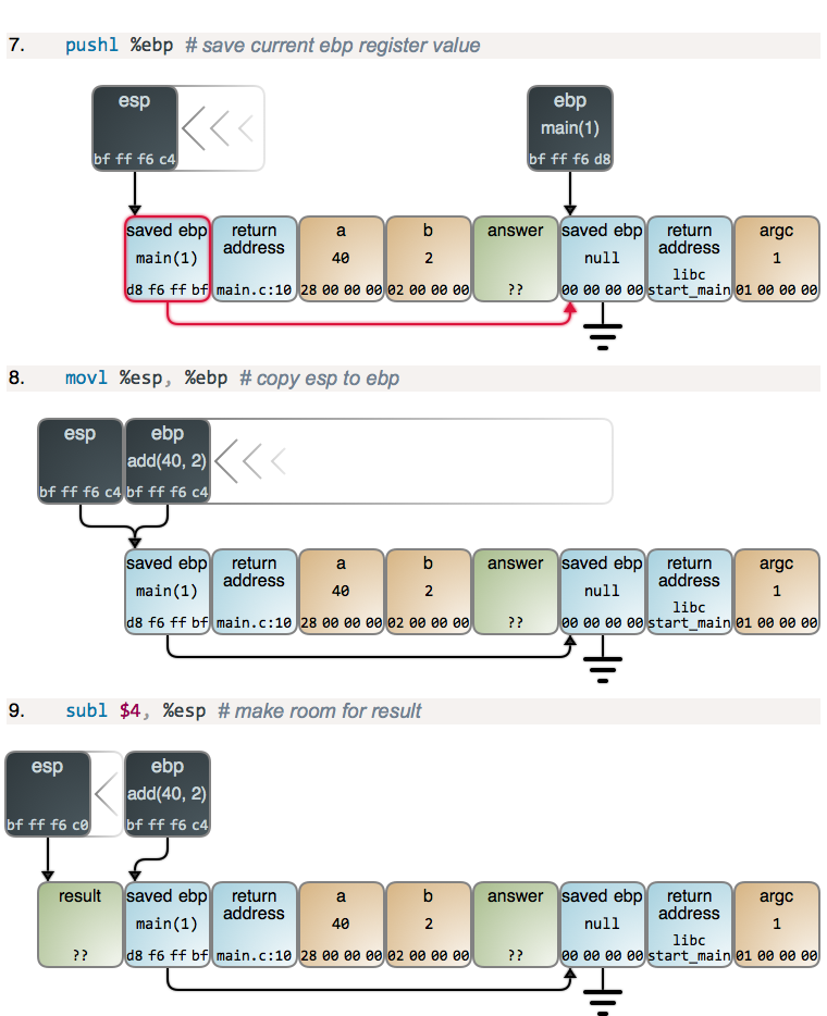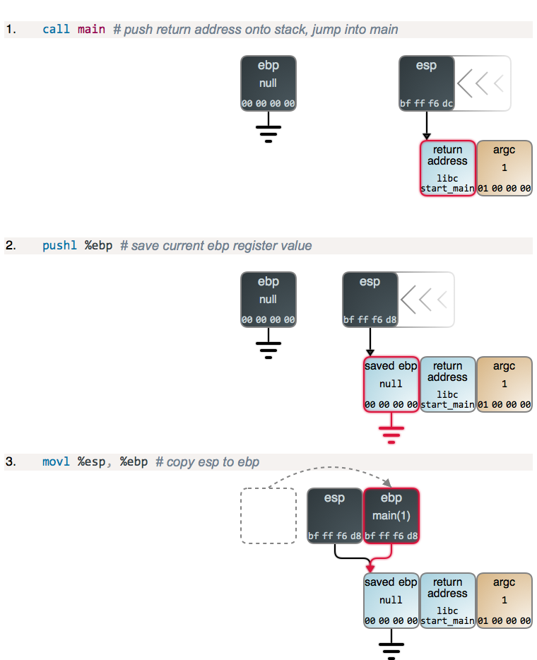 第 2 步和第 3 步,以及下面的第 4 步,都只是函数的 序言 prologue ,几乎所有的函数都是这样的:ebp 的当前值被保存到了栈的顶部,然后,将 esp 的内容拷贝到 ebp,以建立一个新的栈帧。main 的序言和其它函数一样,但是,不同之处在于,当程序启动时 ebp 被清零。