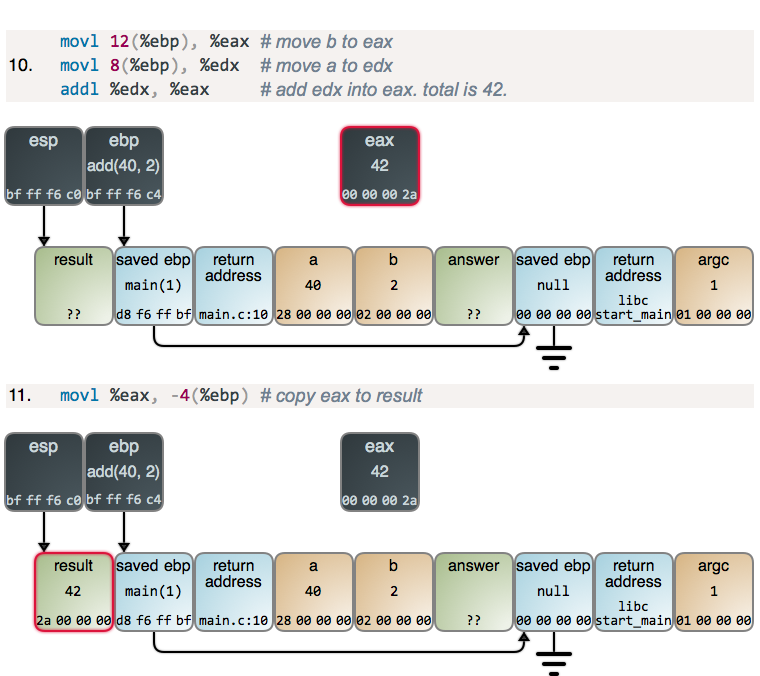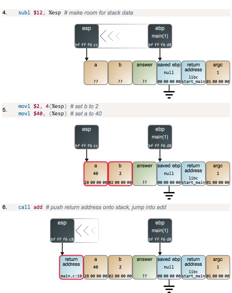 mainesp 减去 12 之后得到它所需的栈空间,它为 ab 设置值。在内存中的值展示为十六进制,并且是小端格式,与你从调试器中看到的一样。一旦设置了参数值,main 将调用 add,并且开始运行:
