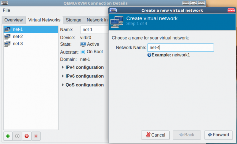 给新网络输入一个名字,然后,点击 “Forward” 按钮。如果你愿意,也可以不创建 IPv4 网络。当你创建一个新的 IPv4 网络时,虚拟机管理器将不让你创建重复网络,或者是使用了一个无效地址。在我的宿主机 Ubuntu 系统上,有效的地址是以绿色高亮显示的,而无效地址是使用高亮的玫瑰红色调。在我的 openSUSE 机器上没有高亮颜色。启用或不启用 DHCP,以及创建或不创建一个静态路由,然后进入下一个窗口。