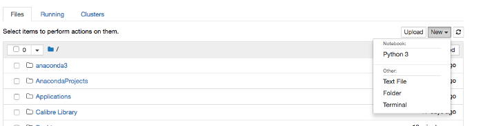 在右上角有一个标有 “New” 的下拉菜单,它使我能够根据自己的指示和代码快速创建新的笔记本。请注意,我的新笔记本默认为 Python 3,这是我目前的环境。