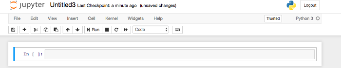 单元格周围的绿色高亮显示你处于编辑模式,蓝色高亮显示你处于命令模式。以下笔记本处于命令模式并准备好执行单元中的 Python 代码。注意,我已将笔记本的名称更改为 “First Notebook”。