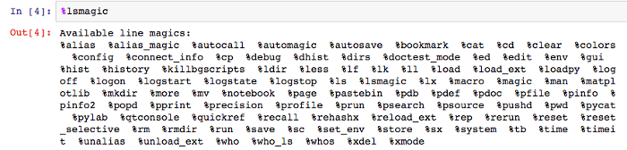 我也可以利用 IPython 的 line magic 和 cell magic 命令。你可以通过在代码单元内附加 % 或 %% 符号来列出魔术命令。例如,%lsmagic 将输出所有可用于 Jupyter notebooks 的魔法命令。