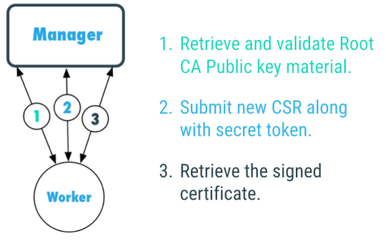 要接收它们的证书而无需共享它们的私钥,新的主机通过发布一个证书签名请求(CSR)来开始,管理者收到证书签名请求之后,转换成一个证书。这个证书成为这个新的主机的身份标识,使这个节点成为 Swarm 的一个完全合格成员!
