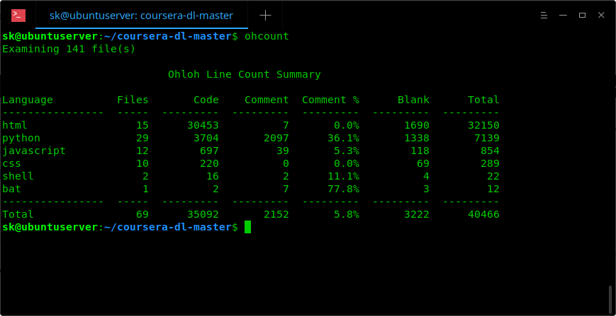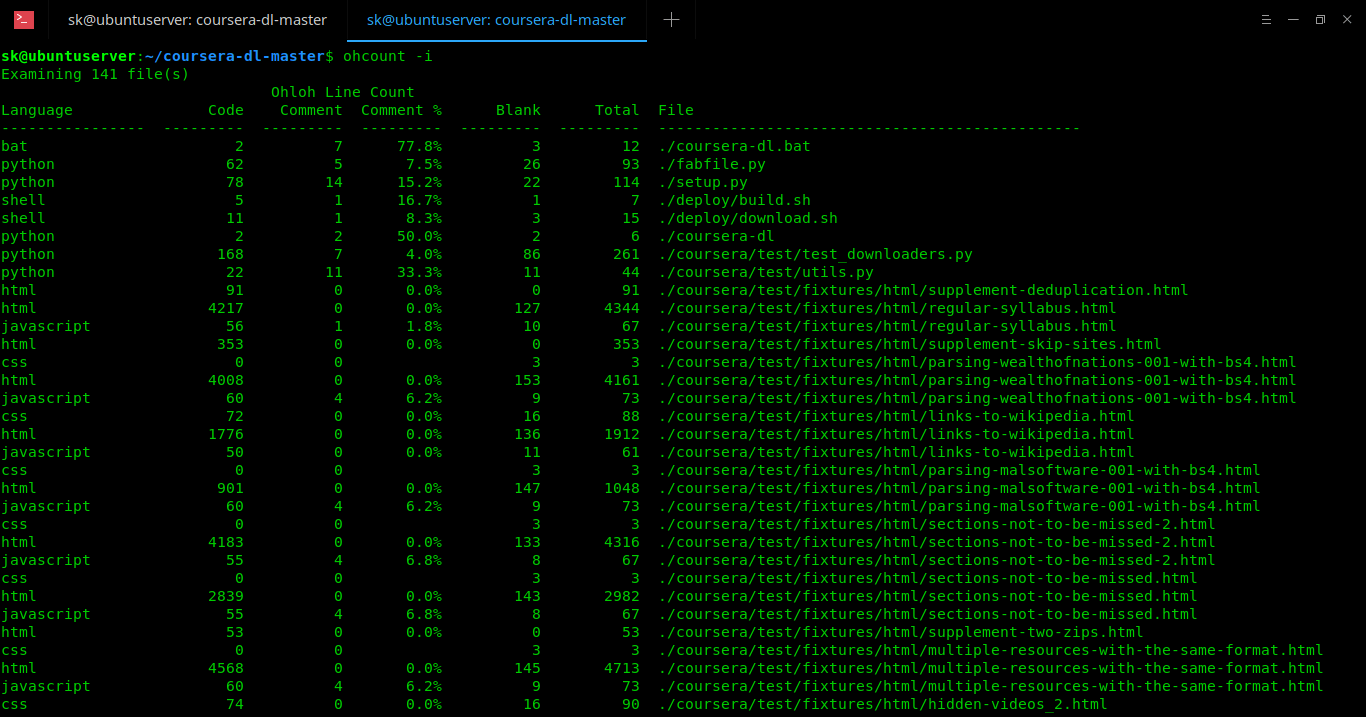 对于想要分析自己或其他开发人员开发的代码,并检查代码的行数,用于编写这些代码的语言以及代码的许可证详细信息等,ohcount 非常有用。
