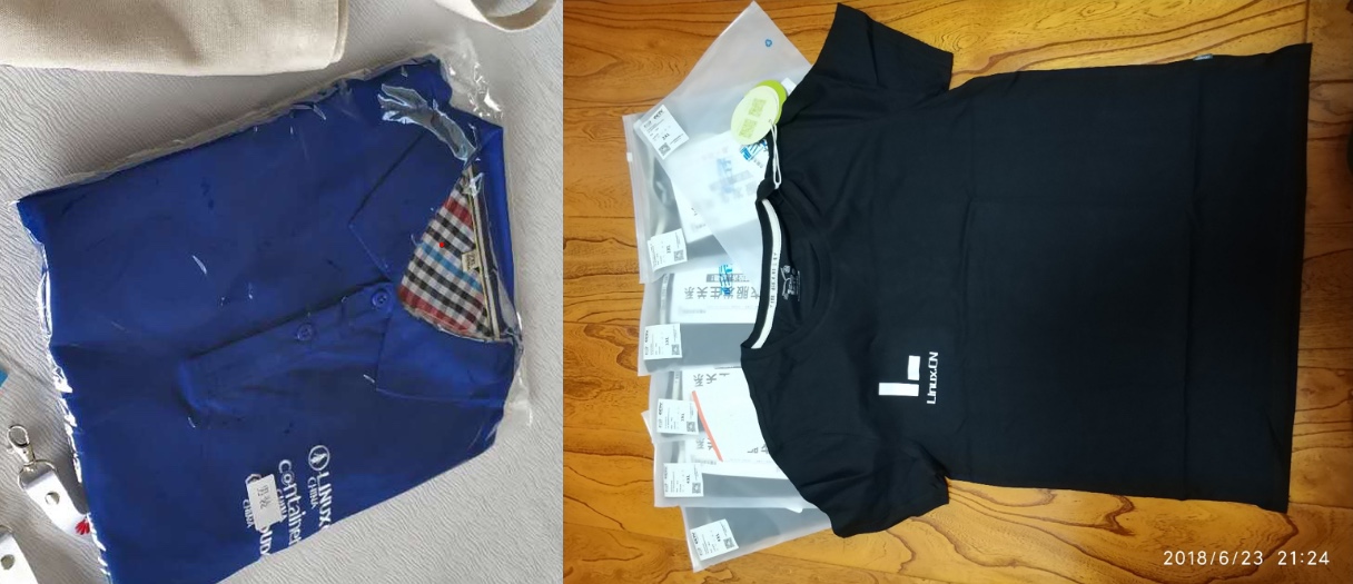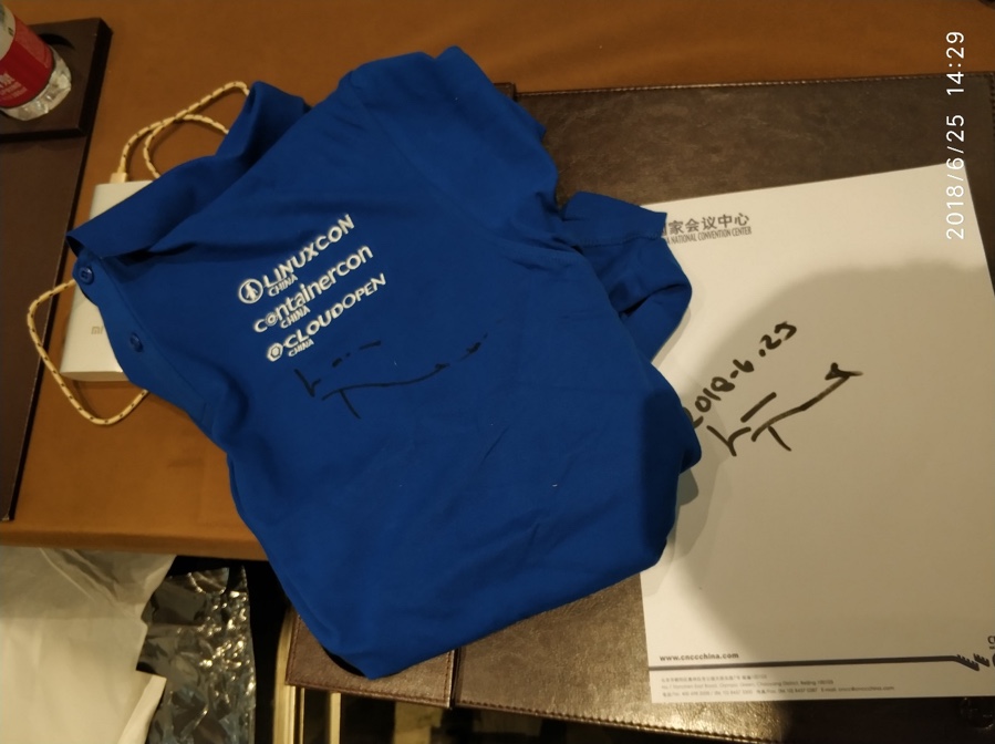 签到之后领到了今年的 T 恤,不像去年,今年是蓝色的啦。 而为了参加这次大会,我还专门制作了咱们 Linux 中国自己的 T 恤。