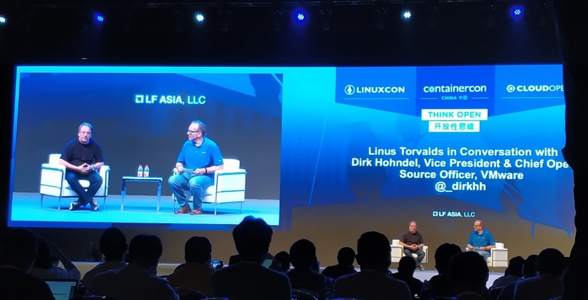 之后便是和 Linus 的一个问答式的对话。之所以采用这种方式是因为 Linus 真的不喜欢公开演讲,所以这种方式会让他感觉稍微好一些。