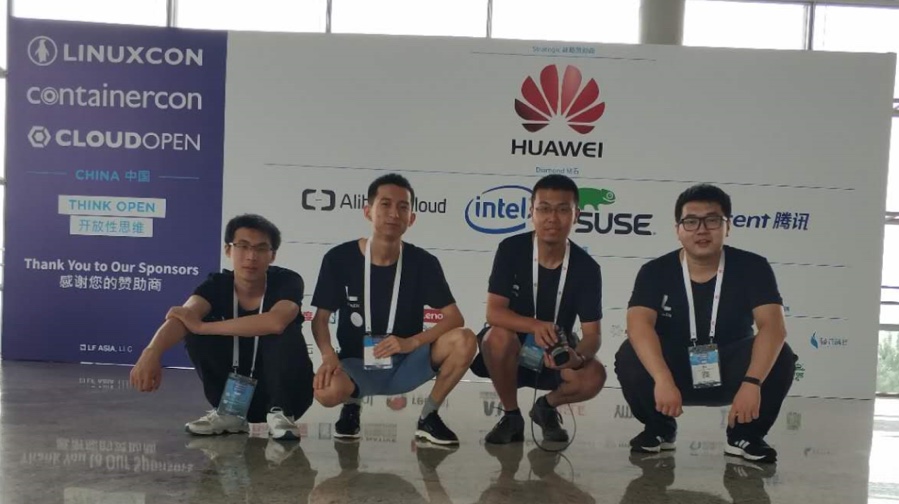 然后趁着中间休息的机会和 Linux 中国的小伙伴们会了面,分了下我们定制的衣服,大家穿起来,一起开心的深蹲合了个影。
