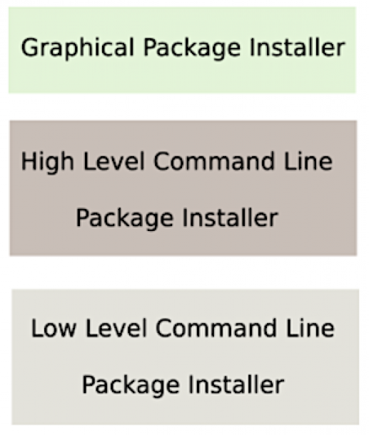 无论你使用的软件包管理是什么,它们通常都是一组构建于另外一种工具之上的工具(图 1)。最底层是一个命令行工具,它可以让你做任何与安装软件相关的一切工作。你可以列出已安装的程序、删除程序、安装软件包文件等等。