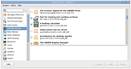 对于基于 Red Hat 的发行版,包括 Fedora、CentOS、Scientific Linux 等,它们的底层工具是 rpm,高级工具叫做 dnf(在旧系统上是 yum)。图形安装程序称为 PackageKit(图 2),它可能在系统管理菜单下显示名字为 “Add/Remove Software(添加/删除软件)”。