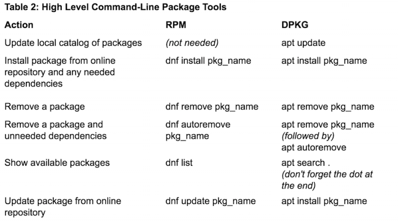 目前在 Linux 发行版中有几个相互竞争的用于管理、安装和删除软件的包管理系统。每个发行版都选择使用了一个 包管理工具 package management tools 。Red Hat、Fedora、CentOS、Scientific Linux、SUSE 等使用 Red Hat 包管理(RPM)。Debian、Ubuntu、Linux Mint 等等都使用 Debian 包管理系统,简称 DPKG。还有一些其它包管理系统,但 RPM 和 DPKG 是最常见的。