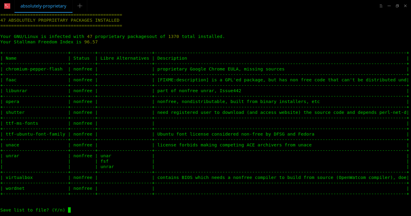 Your GNU/Linux is infected with 47 proprietary packages out of 1370 total installed.
