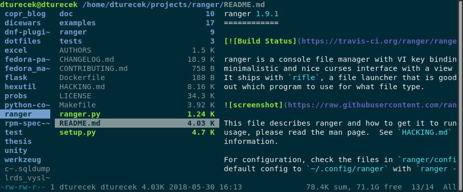 Ranerger 是一个基于文本的文件管理器,它带有 Vim 键绑定。它以三列显示目录结构。左边显示父目录,中间显示当前目录的内容,右边显示所选文件或目录的预览。对于文本文件,Ranger 将文件的实际内容作为预览。