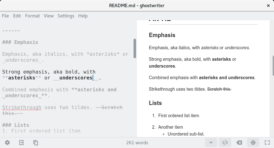 GhostwriterMarkdown 格式的文本编辑器,它有一个最小的界面。它以 HTML 格式提供文档预览,并为 Markdown 提供语法高亮显示。它提供了仅高亮显示当前正在编写的段落或句子的选项。此外,Ghostwriter 可以将文档导出为多种格式,包括 PDF 和 HTML。最后,它有所谓的“海明威”模式,其中删除被禁用,迫使用户现在智能编写,而在稍后编辑。