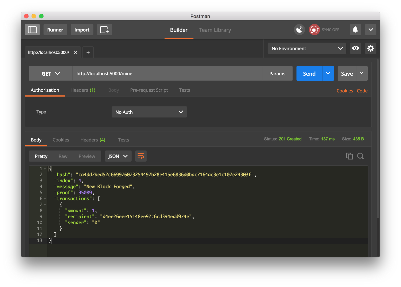这种情况下,如果你愿意,可以使用不同的机器来做,然后在你的网络上启动不同的节点。或者是在同一台机器上使用不同的端口启动另一个进程。我是在我的机器上使用了不同的端口启动了另一个节点,并将它注册到了当前的节点上。因此,我现在有了两个节点:http://localhost:5000 和 http://localhost:5001。