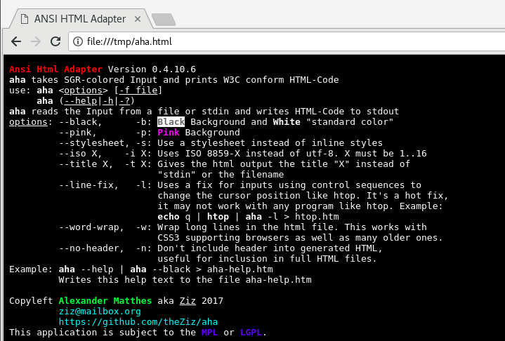 Aha(即 ANSI HTML Adapter)是一个命令行工具,可将终端转义成 HTML 代码。这允许你将 git diff 或 htop 的输出共享为静态 HTML 页面。