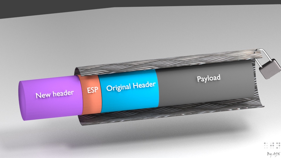 - ”隧道模式“,其中 IP 表头和它的内容都被加密了,并且被封装进另一个 UDP 包内。这个模式被 VPN 所使用 —— 你获取你正传送给一个秘密网站的包,然后加密它,并将它送给你的 VPN 服务器,然后 VPN 服务器再传送给你。