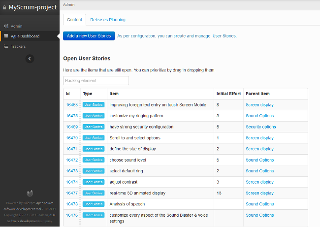 Tuleap 是一个应用程序生命周期管理(ALM)平台,旨在为每种类型的团队管理项目——小型、中型、大型、瀑布、敏捷或混合型——但是它对敏捷团队的支持是显著的。值得注意的是,它为 Scrum、看板、sprints、任务、报告、持续集成、backlogs 等提供支持.