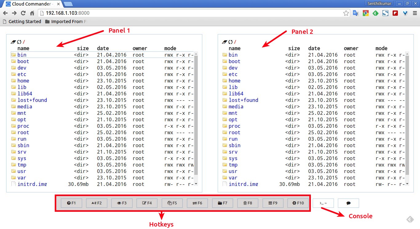 如你所见上面的截图,Clouder Commander 有两个面板,十个热键 (F1 到 F10),还有控制台。