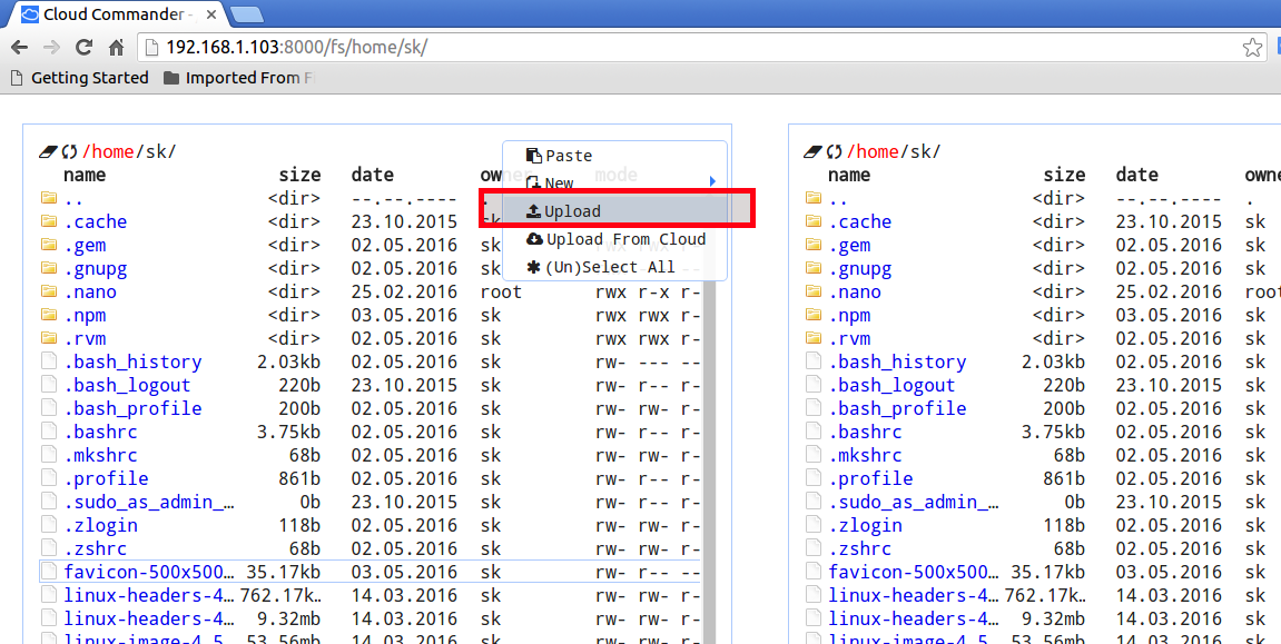 要上传文件,右键单击 Cloud Commander 面板的任意空白处,并且单击“Upload”选项。