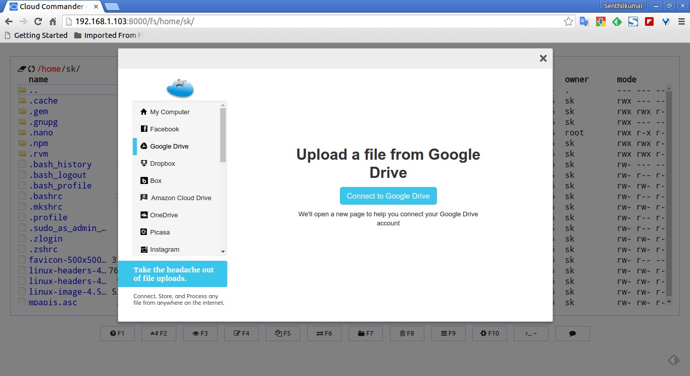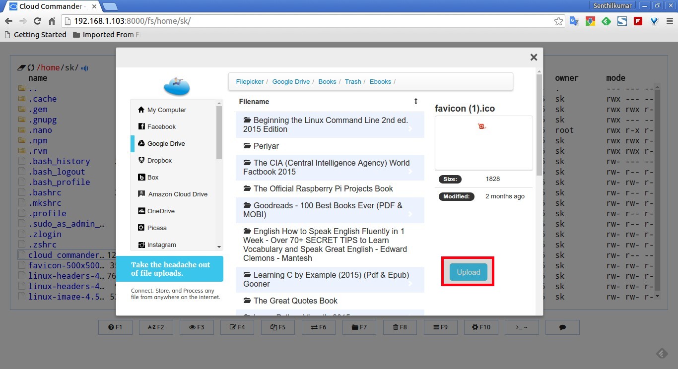 下一步,用 Cloud Commander 验证你的谷歌云端硬盘,从谷歌云端硬盘选择文件并点击“Upload”。